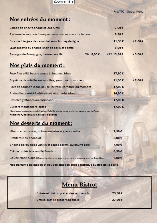 Notre restaurant vous accueil toute l’année du lundi au vendredi midi et soir, ainsi que le samedi soir et le dimanche soir durant les mois de juillet et aout. Dans un cadre authentique vous pourrez dégustez une cuisine variée et de saison, avec des plats du jour cuisinés sur place, des spécialités régionales, un large choix de desserts et de glaces et une carte des vins sélectionée pour accompagner agréablement votre repas. Lorsque le temps le permet, vous pourrez profiter de notre belle terrasse ombragée. N’hésitez pas à consulter la carte ci-dessous.
